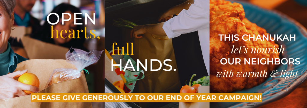 We provide kosher, fresh food to our neighbors who are struggling with food insecurity. Building on a 60 year legacy of kindness, dignity and warmth, we continue to care for all in need.